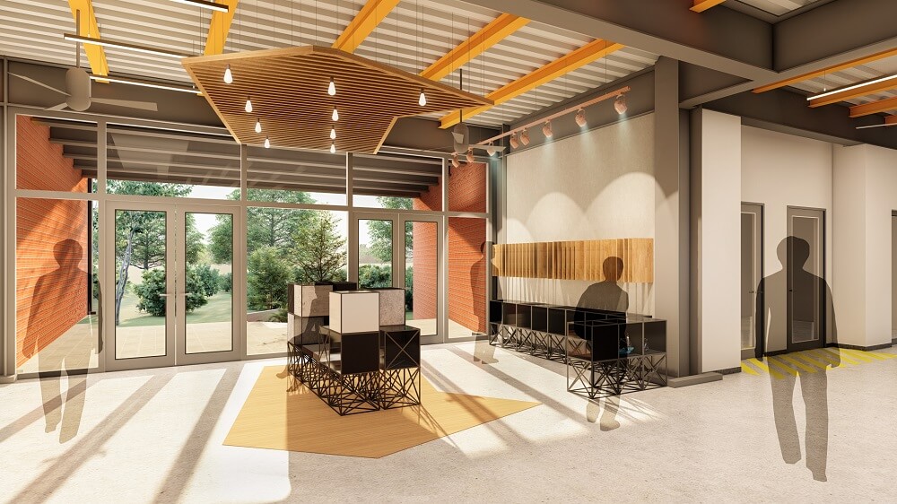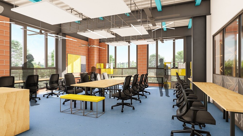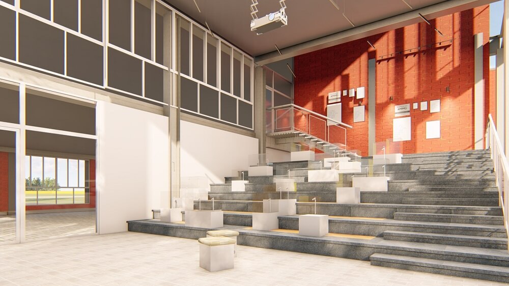 Academic and hostel buildings are constructed as PEB (Pre-Engineered Building) structures with exposed porotherm blocks, creating an organic, grounded aesthetic. The ground floor hosts an automobile design workshop, while classrooms occupy the upper levels. A signature gathering stair at the entrance doubles as a presentation space and gallery for student exhibits.